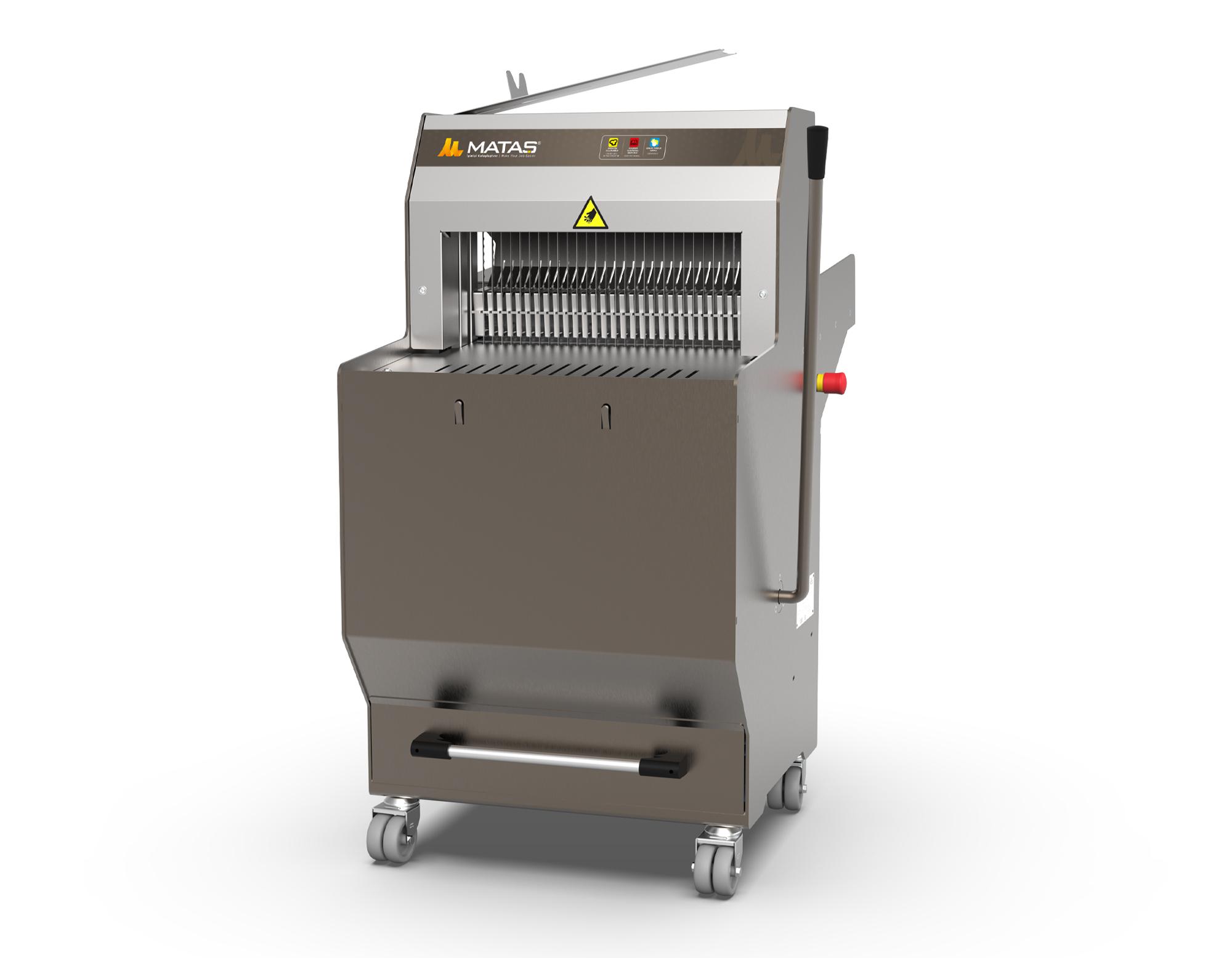 Standart ekmek dilimleme makine modelidir. Satış reyonuna uygun renk seçimi ile dekoru tamamlar. Ekmeğin hızlı ve simetrik biçimde dilimlenmesini sağlar. Ayar gerektirmeden maksimum 4 kg’a kadar her ekmeği dilimler. 8 mm ve üzeri istenilen ölçüler de üretim yapılır. Standart 16-18 mm olarak üretilmektedir. Ekmeğin temas ettiği yüzeyler 304 kalite paslanmaz olup sağlığa zararı yoktur. Tekerlekli olduğundan kolay taşınabilir. Makine üzerinde poşet takma askısı yer almaktadır. Mataş'ın özel üretimi olan bıçakları ile uzun süreli kullanım sağlanmaktadır. İmalat ve montaj hatalarına karşı 2 yıl garantilidir. Ekmek dışında özel üretim; Islama köfte, pestil, cezerye, helva, elma, portakal, kabak tatlısı, siron, kelle-paça, tavuk, burger, ev yapımı sabunları en-boy kesebilen makineler üretmekteyiz.